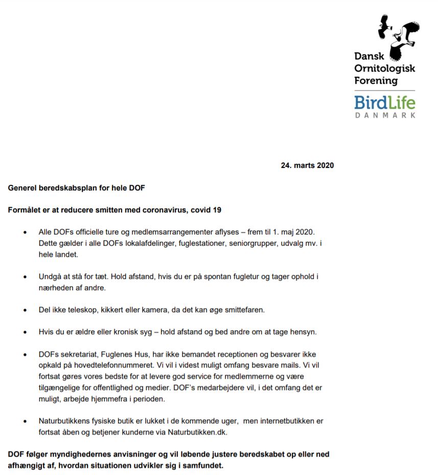 DOF har lige udsendt en opdateret COVID-19 beredskabsplan. Den betyder bl.a., at alle arrangementer er aflyst mindst frem til 1. maj 2020.